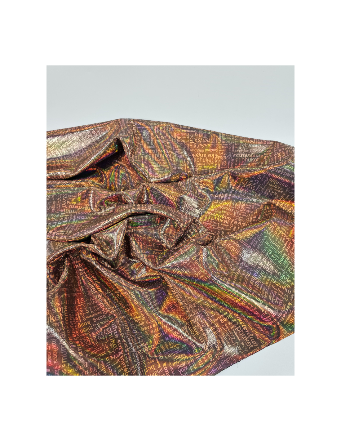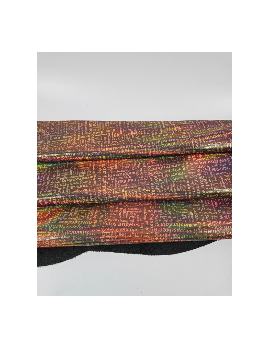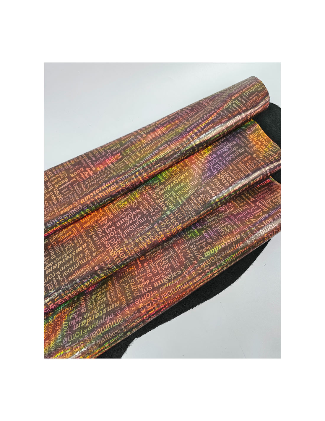 One of a Kind Pattern Printed Leather with an irisdicent Rainbow Effect! This is achieved by applying a foil with metallic on this smooth leather.
